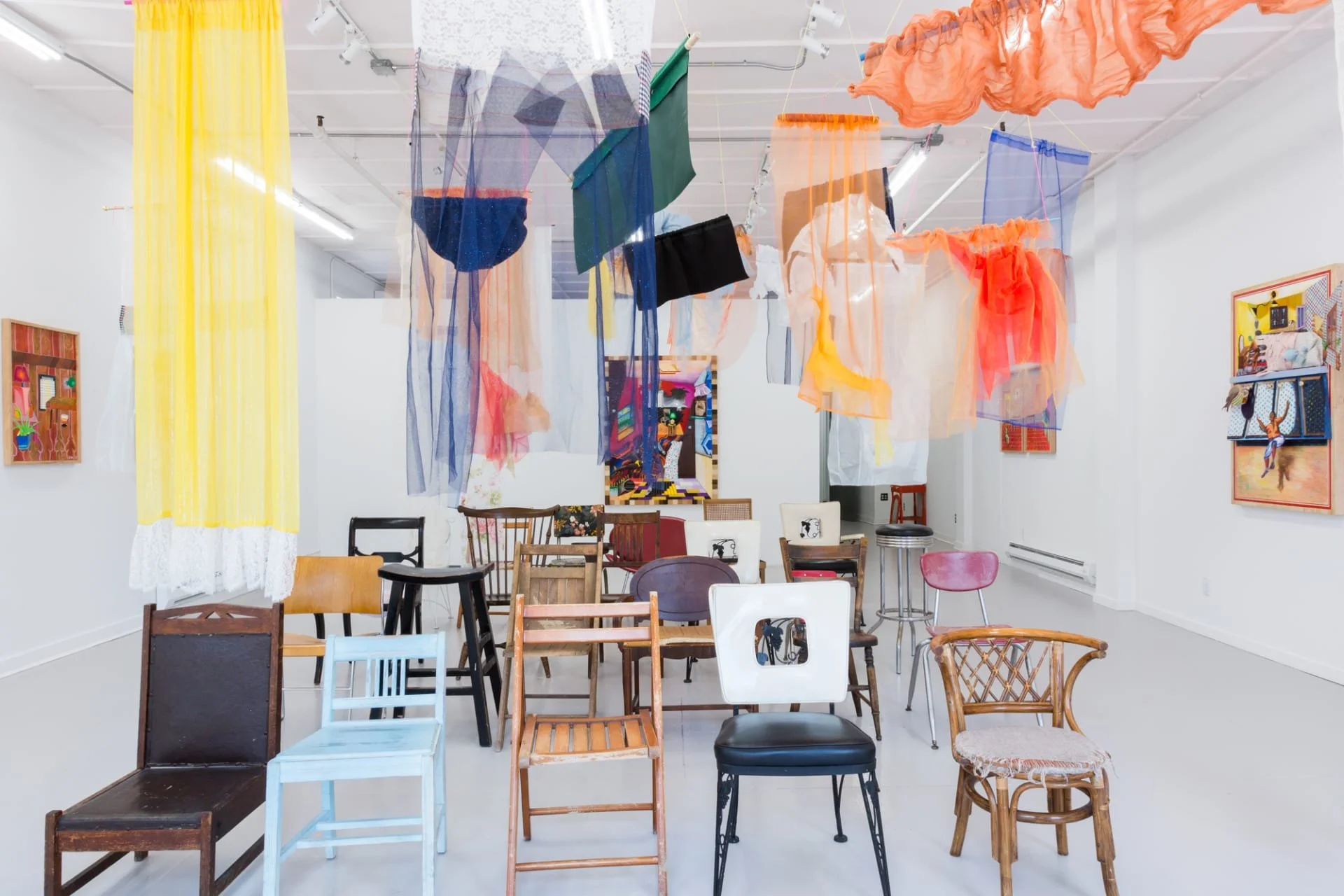 9 doors, two windows, two iron gates, one wooden fence, three chairs, carpet, lilies, James Baldwin and Richard Avedon's "Nothing Personal", Leather, foam board, acrylic, curved wooden doors.